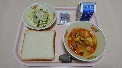 今日の献立は、牛乳パン、ブラウンシチュー、ごぼうサラダ、牛乳でした。