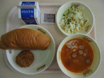今日の給食の献立は、【ミルクパン・牛乳・メンチカツ・コーンサラダ・ミネストローネスープ】でした。