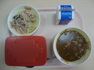 今日の献立は、【麦ごはん・牛乳・チキンカレー・海草サラダ・ミニフィッシュ】でした。