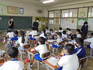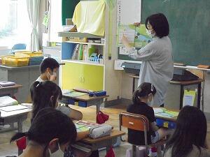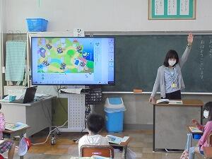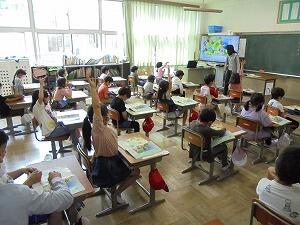 4年教室では、ビビロ先生の発音に耳を澄ませながら、みんな真剣に学習していました。