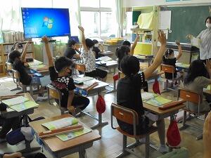教科書、電子黒板を見ながら、先生の問いに答え、生活の仕方について考えていました。