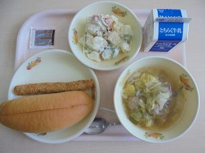 今日の給食の献立は、【コッペパン・牛乳・お魚ソーセージフライ・ミートボールスープ・ポテトサラダ】でした。
