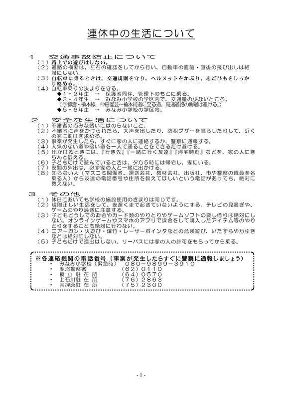 新型コロナウイルス感染防止に留意し、事故やけがのない楽しい5日間を過ごしてほしいと思います。