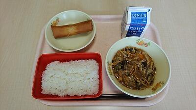 今日の献立は、ご飯、麻婆茄子、春巻き、牛乳でした。