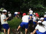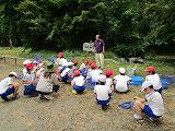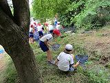 網を手に全員一丸となって、生物集めに夢中になりました。ヤゴや小さな生物など何種類かの生物を発見することができました。子ども達は「これ何ですか。」と渡邉先生に熱心に尋ねていました。