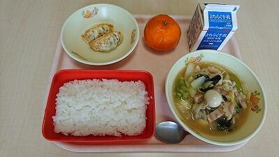今日の献立は、セルフ中華丼(ご飯、中華丼の具)、餃子、冷凍みかん、牛乳でした。