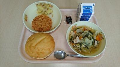 今日の献立は、丸パン、ハムカツ、ジャーマンポテト、ワンタンスープ、牛乳でした。
