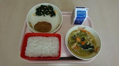 今日の献立は、ご飯、ハンバーグおろしソース、ほうれん草とコーンの和え物、キャベツの味噌汁、牛乳でした。
