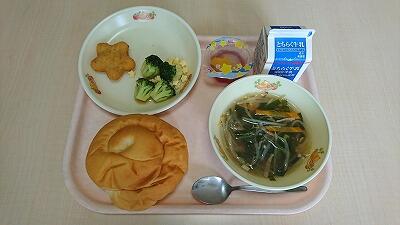 今日の献立は、七夕献立で、バターロール、星型コロッケ、ブロッコリーサラダ、七夕スープ、七夕ゼリー、牛乳でした。
