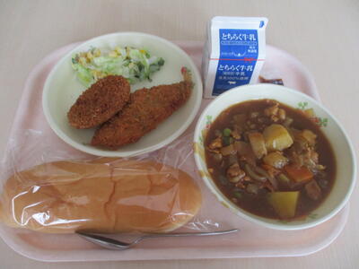 今日の給食の献立は、【ミルクパン、白身魚フライまたはメンチカツ、ブラウンシチュー、フレンチサラダ】でした。