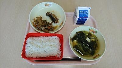 今日の献立は、お魚ランチで、ご飯、イワシのおかか煮、五目きんぴら、豆腐の味噌汁、牛乳でした。