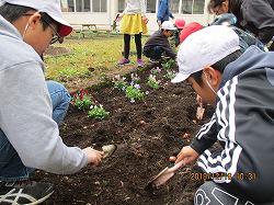 今日のいきいきタイムに、自然愛護委員会の児童が、花壇にビオラとチューリップの苗を植えてくれました。