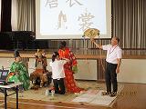 昨日、県立博物館の方を講師に招いて、6年生が「十二単・鎧着用体験」を行いました。