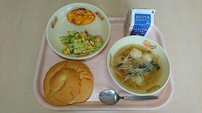 今日の献立は、バターロール、トマトミートオムレツ、春キャベツのサラダ、えび団子スープ、牛乳でした。