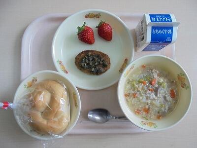 今日の給食の献立は、【米粉パン・牛乳・ハンバーグニラソースかけ・はと麦雑炊・いちご】でした。