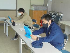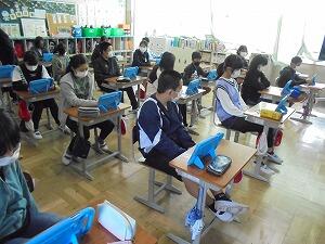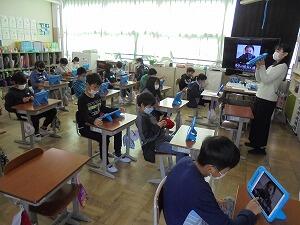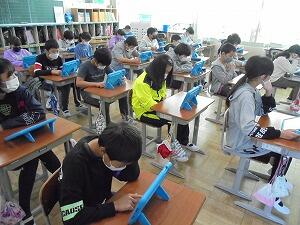 1.2年生は体育館で、3~6年生は各自のタブレットを使ってリモートで実施しました。