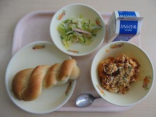 今日の給食の献立は、【ミルクツイストパン・牛乳・ポテトミートグラタン・コールスロー】でした。