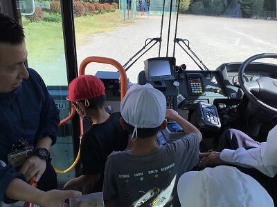 まず教室で時刻表の読み方などオリエンテーションの後、校庭でバスの乗車体験をしました。