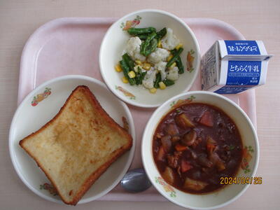 今日の献立は、メープルトースト、ブラウンシチュー、イタリアンサラダ、牛乳でした。