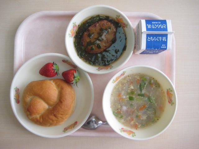 メニューは、【さつきの舞米粉パン・牛乳・はとむぎ雑炊・ハンバーグにらソースかけ・いちご】です。