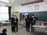 かんたん楽しい入門講座「能と狂言」ということで、能と狂言を比べながら分かりやすく、解説をしてくださいました。最初に能Verと狂言Verで自己紹介があったり、一緒に<羽衣>といううたをうたったりしました。最後には扇子を始め、面、太鼓や笛まで体験させていただきました。本日は、大変お世話になりました。