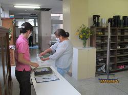 【朝の健康チェックと手指の消毒の様子】