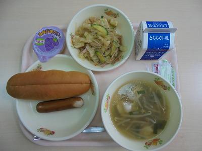 今日の給食の献立は、【コッペパン・牛乳・ソーセージ・春雨サラダ・餃子スープ・ぶどうゼリー】でした。