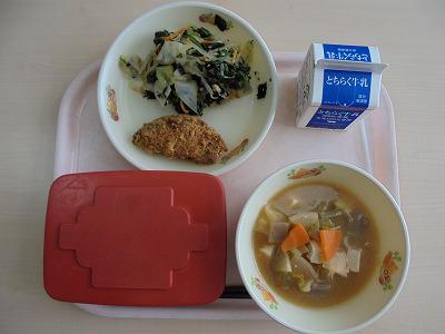 今日の給食の献立は、【ご飯・牛乳・アジフライ・のり和え・みそ汁】でした。