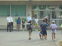 昨日の一斉下校の際、新しい学習指導員の楠先生の紹介を全校児童に行いました。