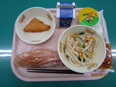7月1日の献立は、サラダうどん、チーズはんぺんフライ、ミニミルクパン、はちみつレモンゼリー、牛乳でした。