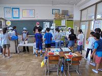 各学年が指定された場所に移動し、竜巻による被害から自分を