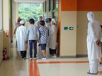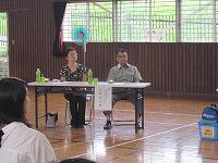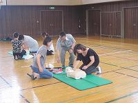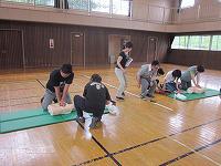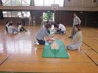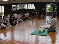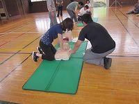 1年生の保護者、保健部員、教職員が参加して、講話を聞いた後、心肺蘇生の心臓マッサージ
