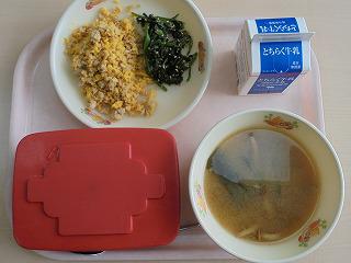 今日の給食の献立は、【セルフ三色丼・牛乳・なめこ汁】。