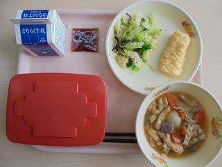 今日の給食の献立は、【セルフいか天丼・牛乳・昆布漬け・田舎汁】です。