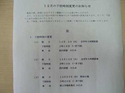 以前、お知らせしましたとおり、明日は午後2時に一斉下校となります。