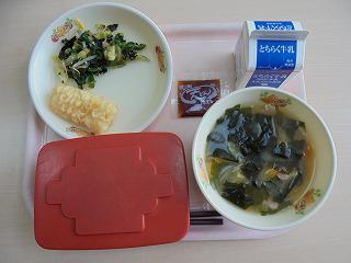 今日の給食の献立は、【ごはん・牛乳・いかの天ぷら・のりあえ・みそ汁】でした。