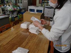 養護教諭が、手指を消毒しゴム手袋をして、安全面に十分配慮しながら、マスクを一枚一枚確認し、各学年に振り分ける作業を行いました。