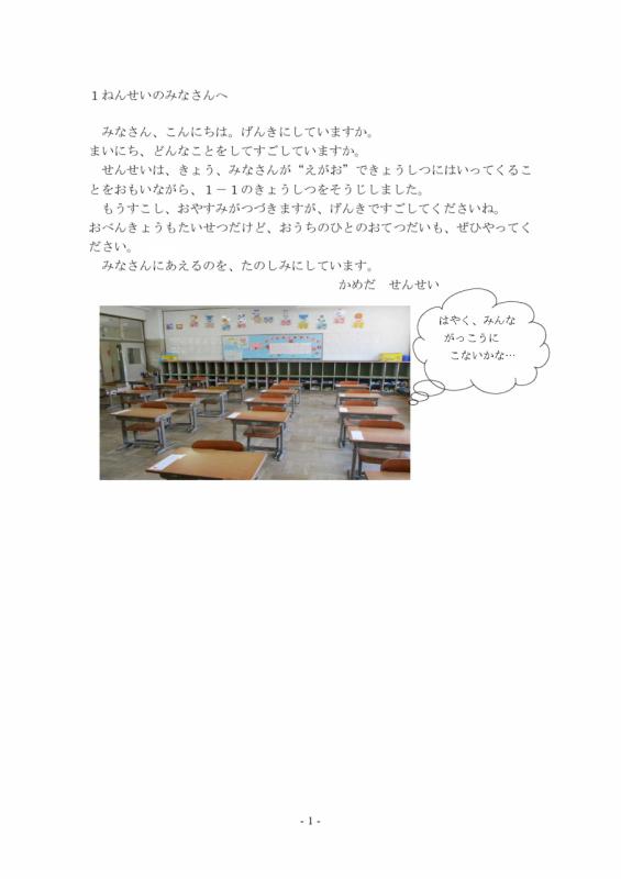 学校再開に向けての登校日でありますので、毎週30分ずつ学校で過ごす時間を長くしました。下校時刻が、毎週30分ずつ遅くなりますのでご承知おきください。 ※5月11日(月)に通知を配布いたします。