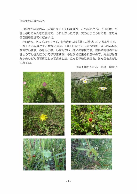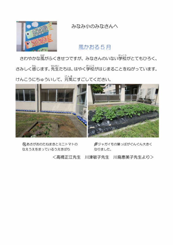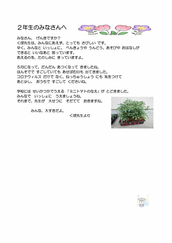 中庭では、朝顔の種を植えたり、ミニトマトに水やりをしたり‥‥、教室では家庭学習プリントについての説明を受けたり‥‥と、短い時間ではありましたが学校生活を実感する貴重な登校日になったことと思います。