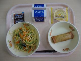 今日の給食の献立は、【冷やし中華・牛乳・みそ入り春巻き・レモンカスタードタルト】でした。