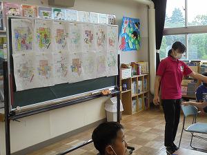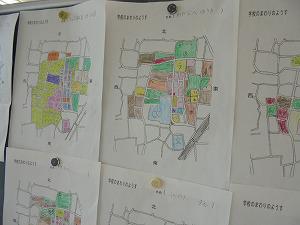 「学校のまわりのようす」について、自分たちが作成した地図を掲示しながら、学習のまとめをしていました。