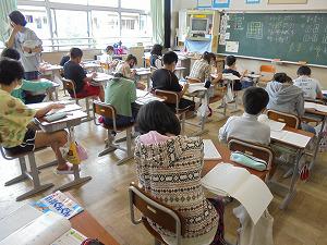 週の始めの6時間目。ともすると、疲れが授業態度に出てしまいそうな時間帯ですが、先生の問いかけに対して、すぐにワークシートに筆を走らせる姿は、高学年らしくしっかりしたものでした。