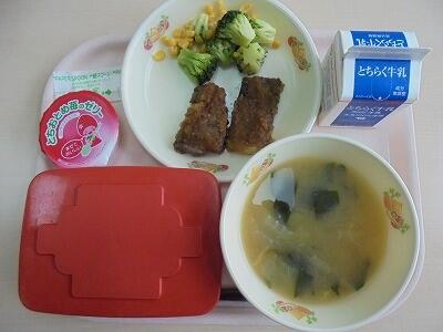 今日の給食の献立は、【ご飯・牛乳・鹿沼和牛のステーキ・ブロッコリー・なめこ汁・とちおとめいちごのゼリー】でした。