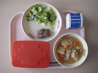 今日の給食の献立は、【ご飯・牛乳・かつおのゆずみぞれ煮・キャベツの塩こんぶ漬け・どさんこ汁】でした。