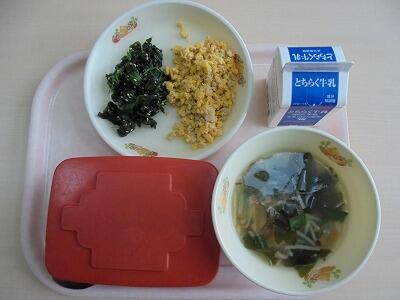 今日の給食の献立は、【ご飯・牛乳・三色丼の具・韓国風わかめスープ】でした。