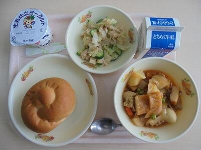 今日の給食の献立は、【米粉パン・牛乳・インド煮・かんぴょうサラダ・県産ヨーグルト】でした。