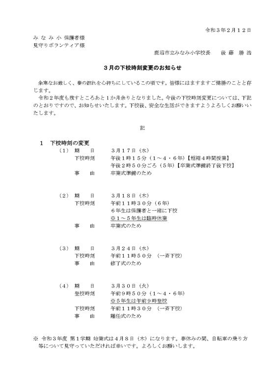 先月お知らせしましたとおり、3月後半は下校時刻が変更になる日があります。
