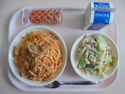 今日の給食の献立は、【シーフードスパゲッティ・牛乳・コールスロー・チーズドック】でした。