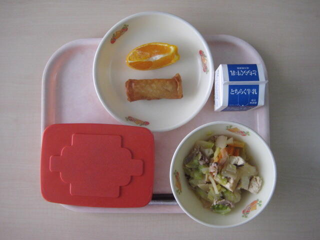 今日の給食の献立は、【ご飯・牛乳・ジャージャンドウフ・春巻き・デコポン】でした。