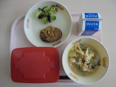 今日の給食の献立は、【ご飯・牛乳・ハンバーグおろしソースかけ・ボイルブロッコリー・みそ汁】でした。